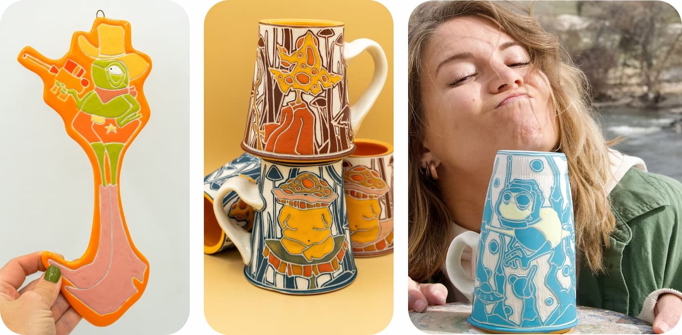 Hey Sarah Anderson and Austin Coudriet here! We each started our ceramics journey in college - Austin enrolled in a sculpture degree, then quickly changed to ceramics after falling in love with the material itself and the energetic community. Sarah began as a ceramics major and then eventually switched to a sculpture degree to explore mixed mediums.