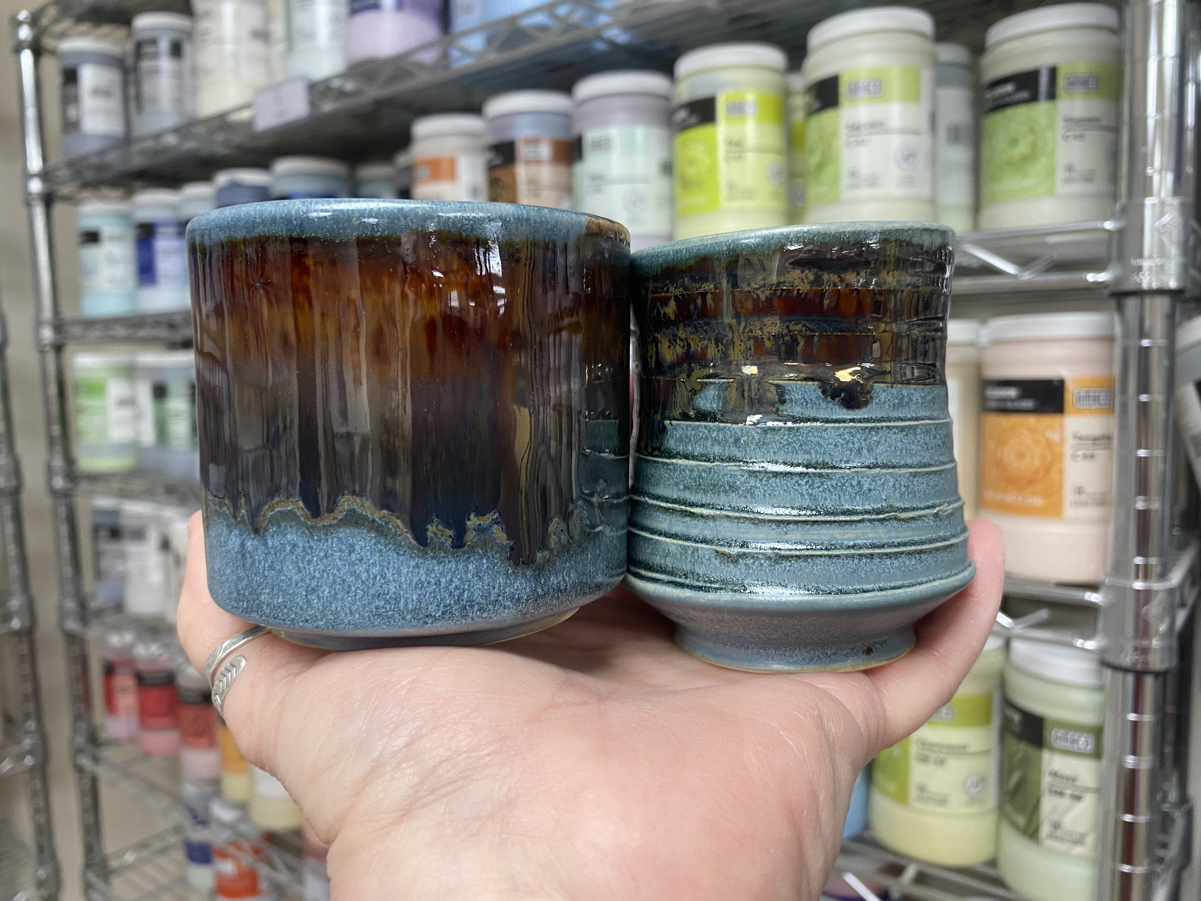 We made these samples by applying the bottom glaze all over, then just applying the top glaze in a narrow stripe near the rim to give them room to move. We used sample cups with a strong horizontal texture to slow down the flow, and smooth cups to show how they move.