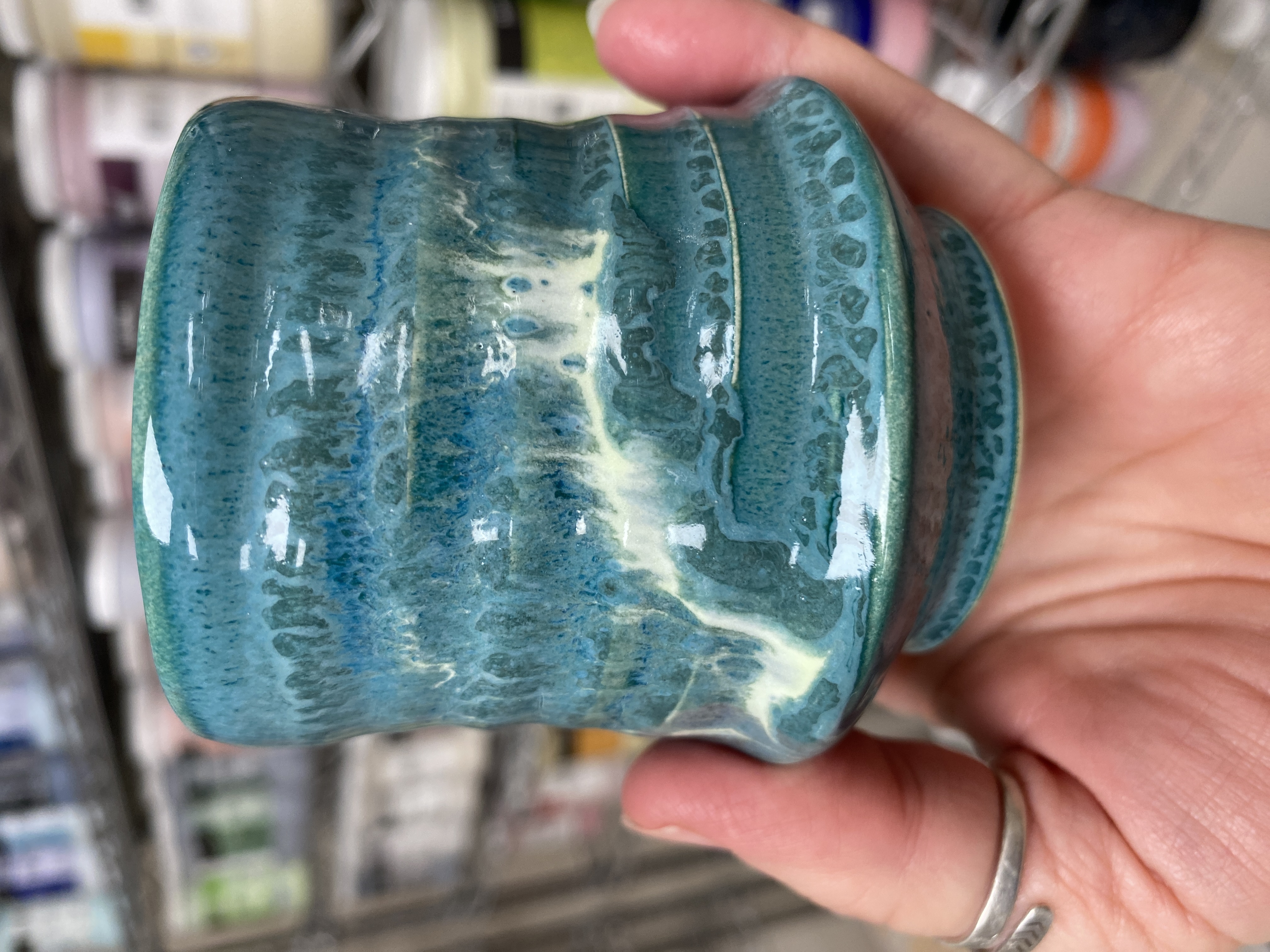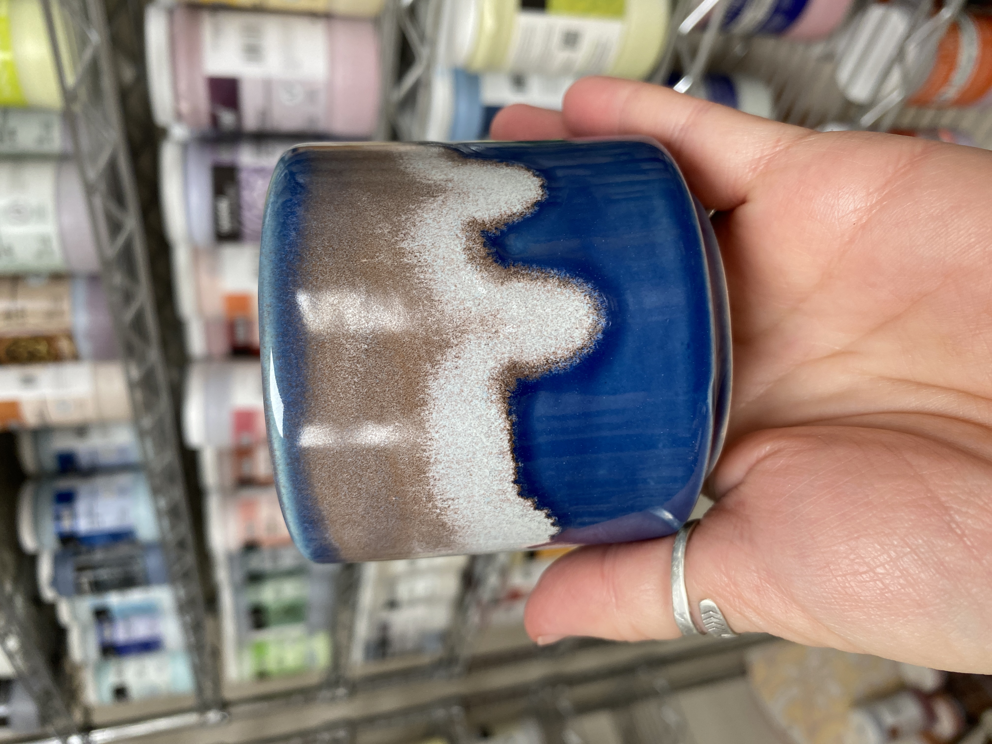 She’s a runner! Lapis Flow is a dramatic fluid indigo over Textured Turquoise. Be careful, these are both fluid glazes, so you want to use them where they won’t flow onto your kiln shelf! 2 coats PC-14 Lapis Flow over 2 coats PC-25 Textured Turquoise, fired to cone 6 on A-Mix White Stoneware