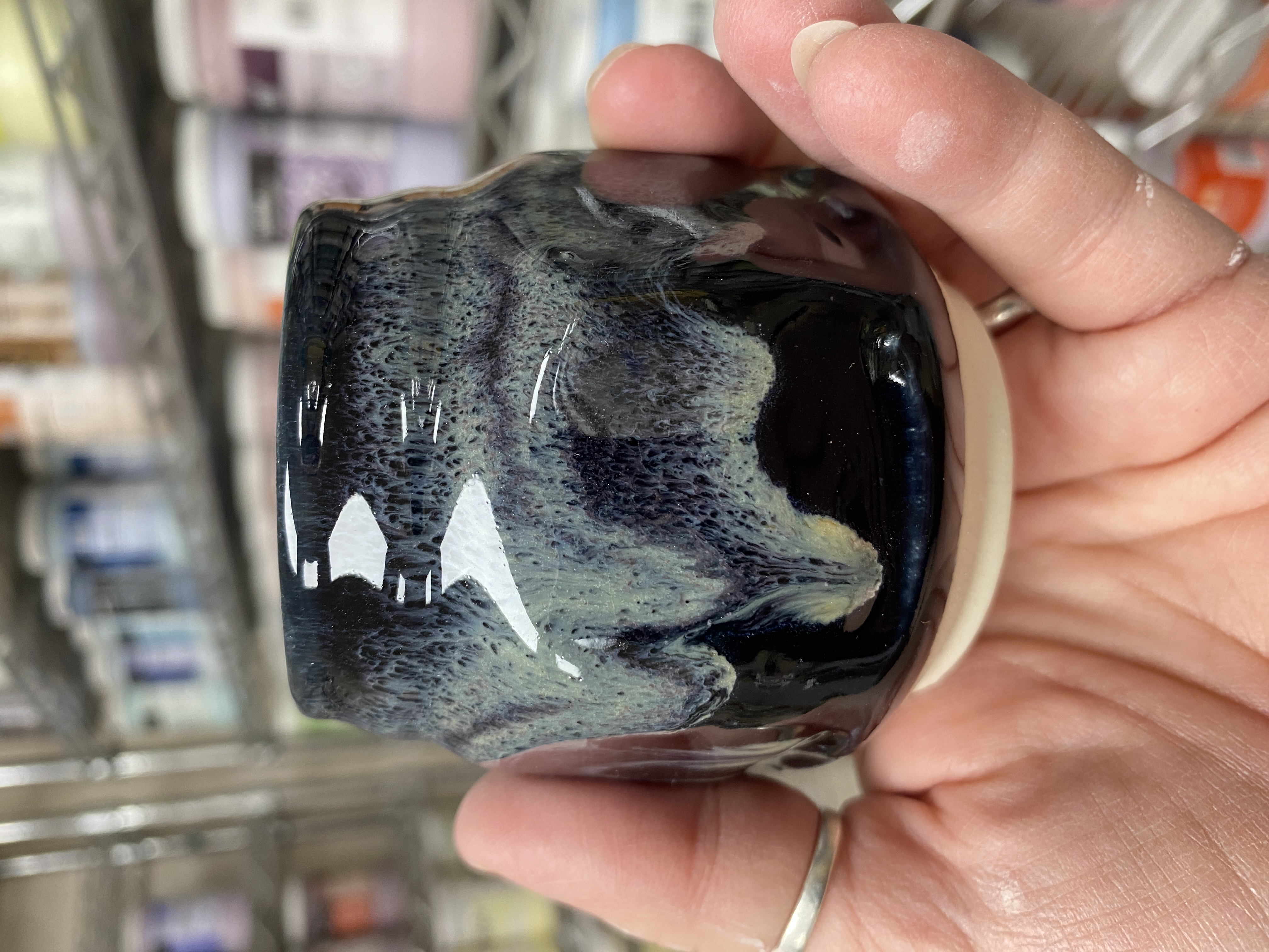 This combination creates a lovely visual texture in an unexpected color. We brushed 2 coats of PC-32 Albany Slip Brown over a single dip of DL-1 Ebony for this mysterious look. Cone 6.