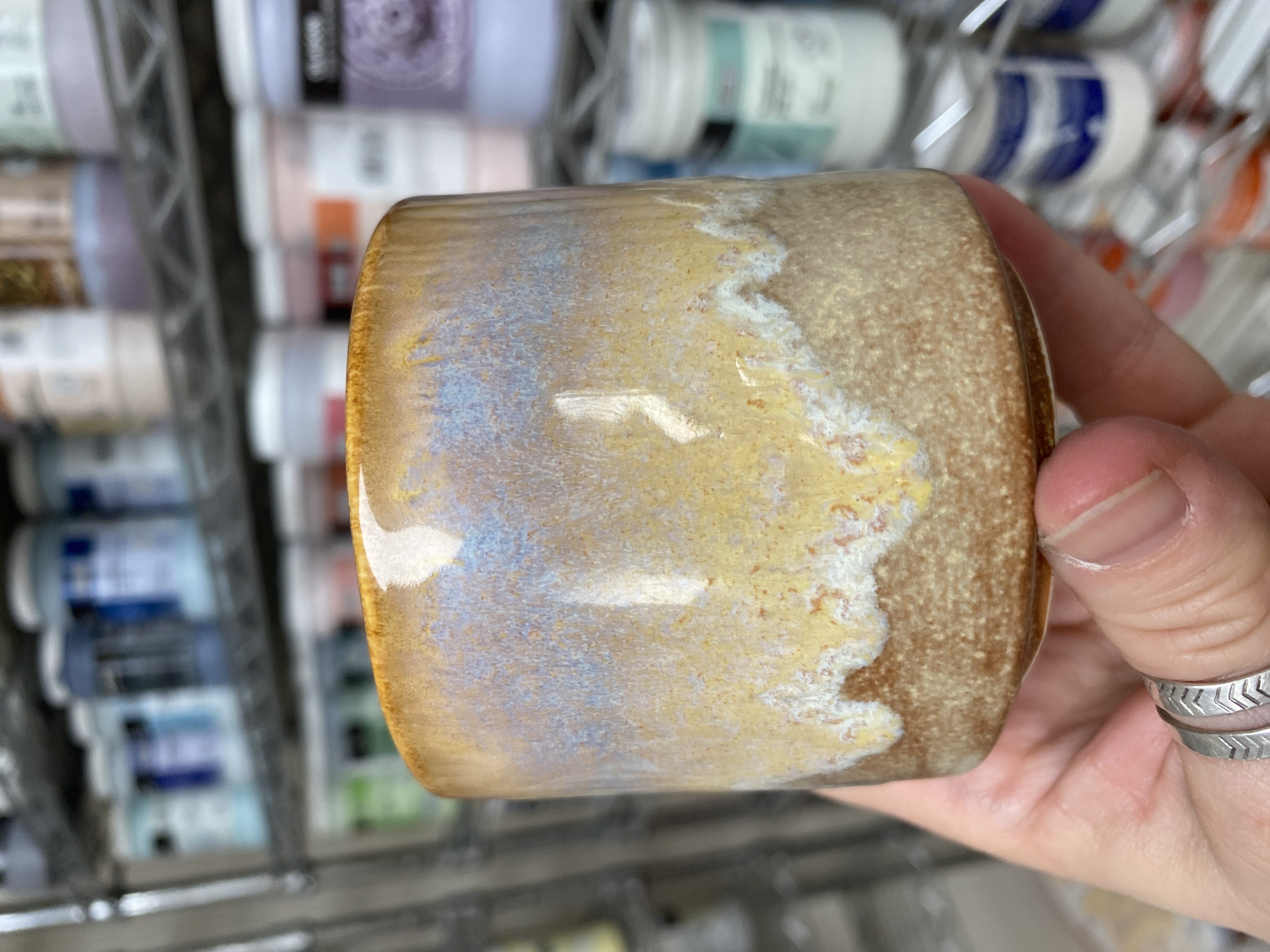 Warm and cozy, this combination will warm you up. 2 coats PC-19 Moon River over 2 coats Sh-12 Chai Matte Shino. Cone 6, A-Mix White Stoneware