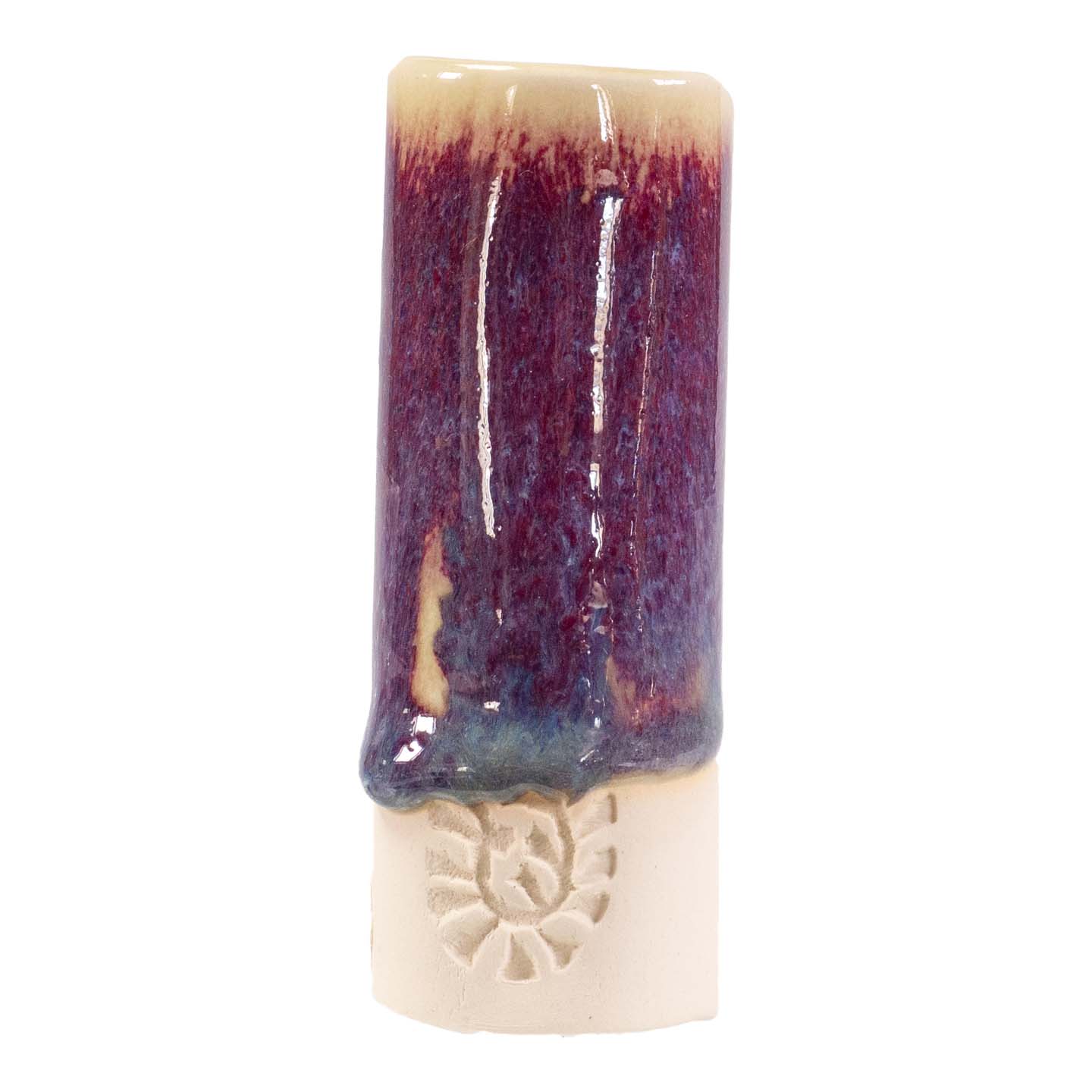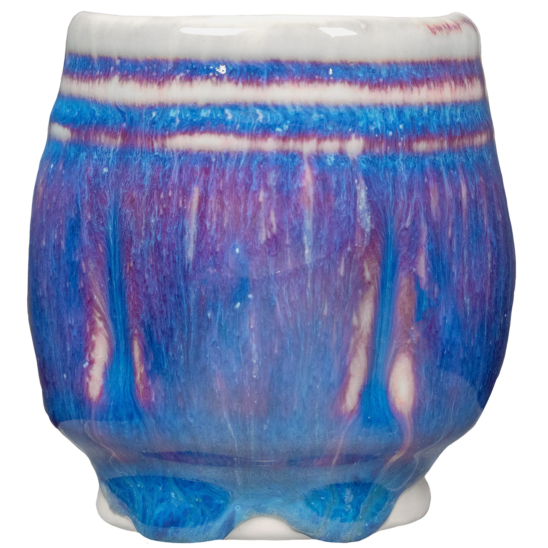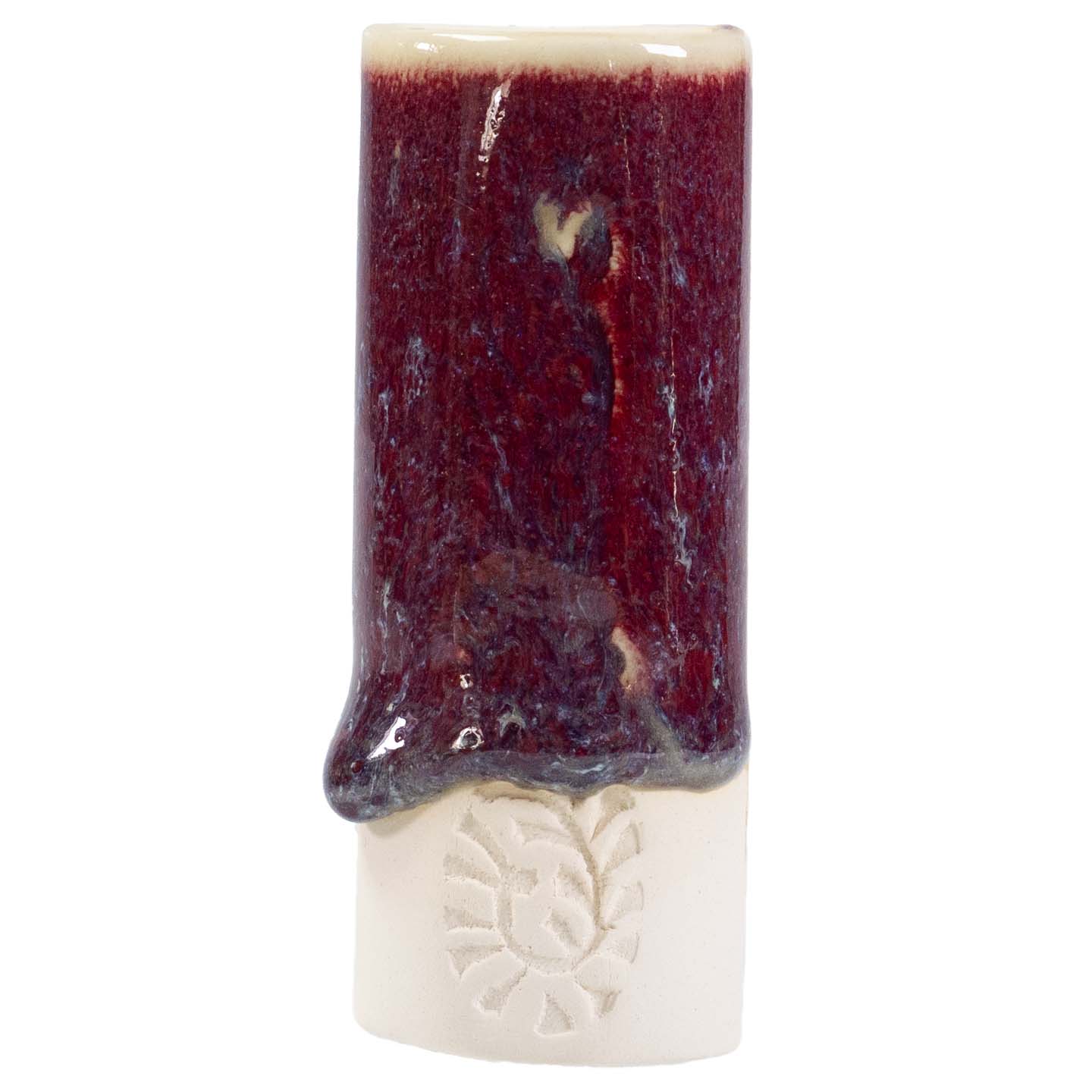 still required. Layering Copper Red with other glazes may not be successful and may increase running even as it reduces the red result. Shown is 2 coats PC-21 Arctic Blue over 2 coats PC-70 Copper Red, fired to cone 6 on A-Mix White Stoneware.