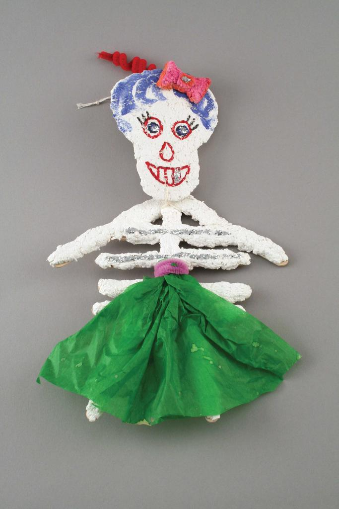 When fully constructed, the “naked” calaveras are very sturdy and will accommodate an array of applied media. Tempera, acrylic paint, and markers work well for facial detail or shoes, while tissue paper or fabric works well for clothing or accessories. Pipe cleaners (craft stems), as well as glue, work well for firmly attaching clothing. Other possible additions include ribbon, pom poms, googly eyes, found objects, or even accessories crafted from left over mixed Claycrete®. Yarn for hair and beads, buttons, sequins, or glitter for embellishment completes each character.