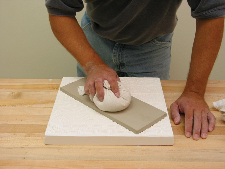 Roll out 1/4″ thick slab of clay and cut out a 11″ x 4″ rectangle using a sharp clay cutting tool (save the remaining scraps of clay for later use in this project). Place rectangle onto textured plaster slab framing your composition. Firmly tamp clay onto textured slab using a sandbag (this will help to impress all of the texture and keep the clay from moving when rolled with a pony roller).
