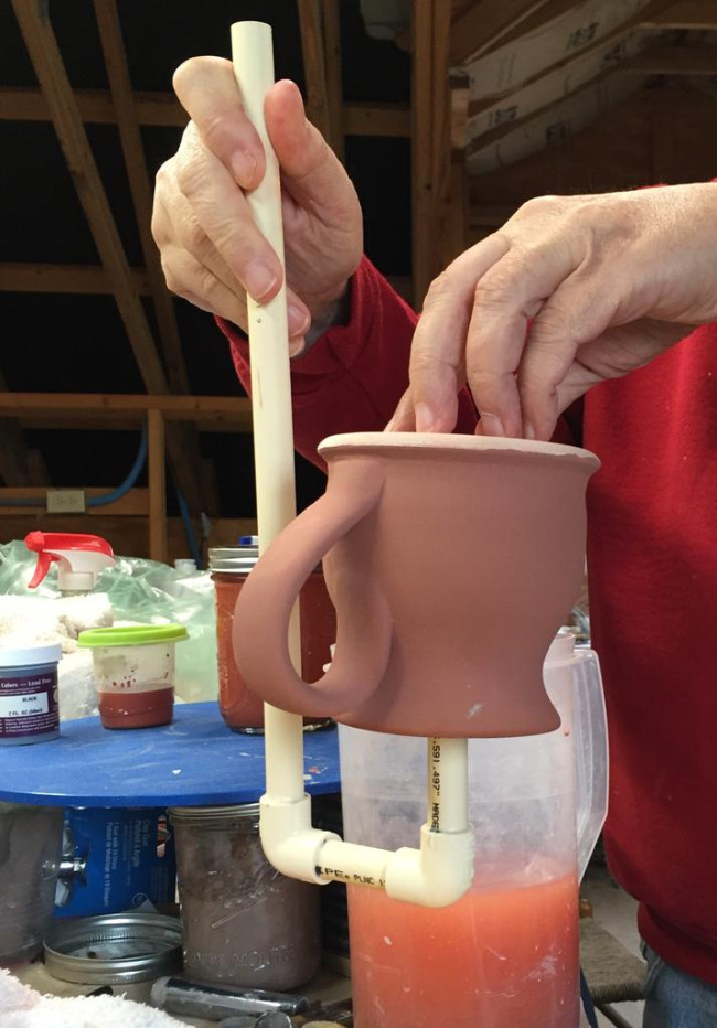 Into a sieved, well-mixed glaze bucket, insert the tool into your mug with sponge resting on the inside-bottom of your mug. Hold the mug upside down, with one hand hold the taller piece of pvc and the other hand on the outside bottom of your mug.....and dip. You won't have to wax the piece because you can tightly control the depth to which you dip your piece!